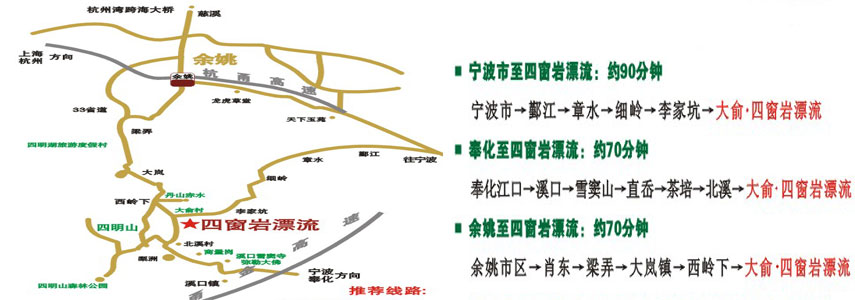 四窗岩漂流位于余姚四明山腹地大岚镇大俞村,距国家AAAA旅游景区丹山赤水仅5公里。宁波第一名胜“四窗岩”距漂流起漂点仅100米。四窗岩漂流山势险峻、风光怡人。这里不仅可感受到皮筏的激情飞浪、还可领略竹筏漂流的休闲浪漫。景区设有水上游乐区、碰碰船、水上自行车、蹦跳床、水上步行球、滚筒等众多水上游乐项目,定会让您乘兴而来,尽兴而归。